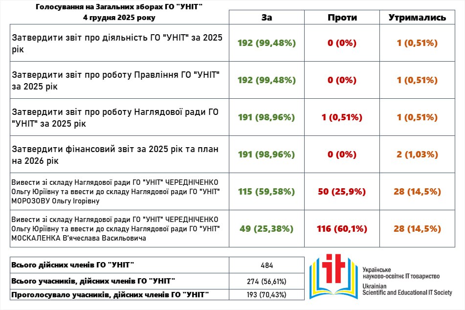 Результати голосування на Загальних зборах ГО “УНІТ” (04.12.2025 року, в дистанційному форматі)